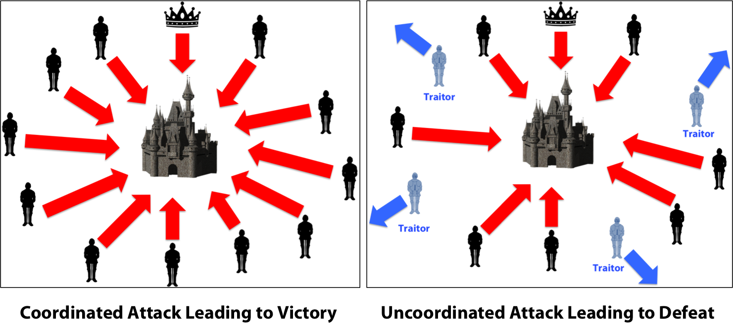 Nội dung bài toán mô tả: Một đạo quân đi chiếm thành và các vị tướng nằm ở nhiều vị trí khác nhau. Trong đó có N tướng trung thành muốn chiếm thành và M tuớng phản bội muốn rút binh.Một tướng phản bội truyền tin cho một nhóm là tấn công và truyền tin cho nhóm khác là rút binh. Vậy làm sao để các tướng có thể nhất quán thông tin và cùng nhau chiếm thành? Chỉ cần một sơ xuất trong việc truyền tin có thể khiến cả đạo quân có thể bị tiêu diệt.