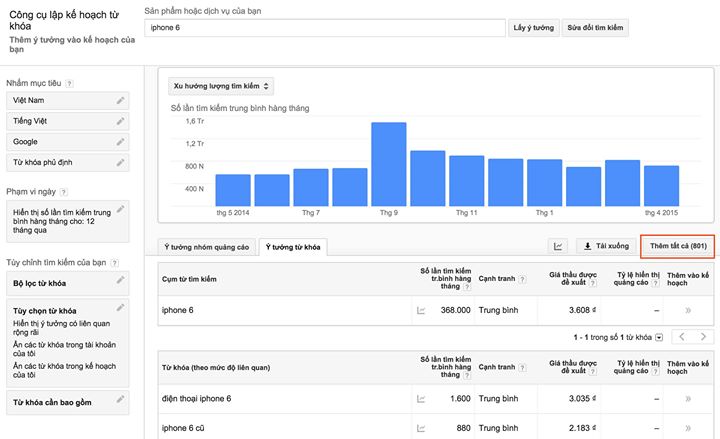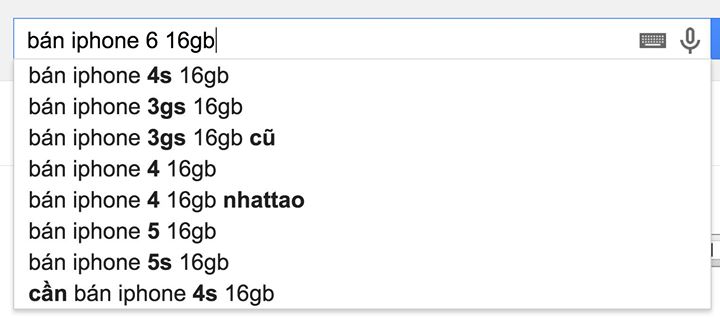 Trong ví dụ này, Google liết kê ra tới 800 từ khoá liên quan tới từ khoá nghiên cứu “iphone 6”