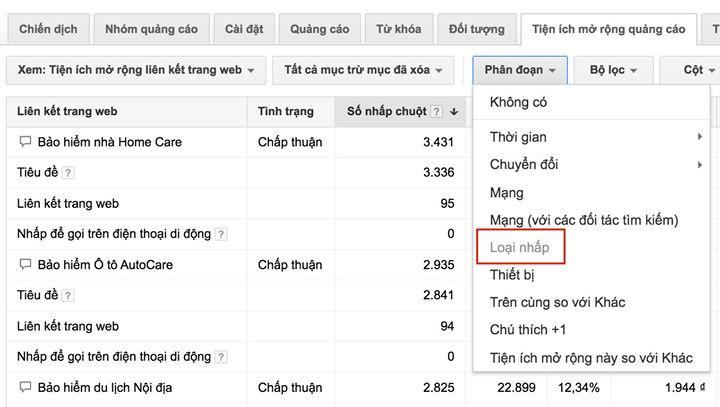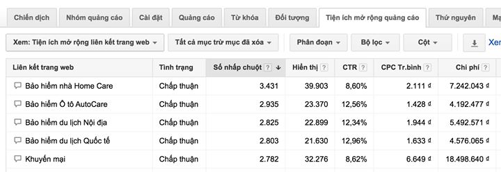 Số liệu các bạn xem ở tab “Tiện ích mở rộng” không phải chính xác là số người click vào tiện ích đâu nhé. Chỉ số tổng số click chuột vào mẫu quảng cáo (bao gồm tiêu đề, liên kết, các tiện ích khác …)
