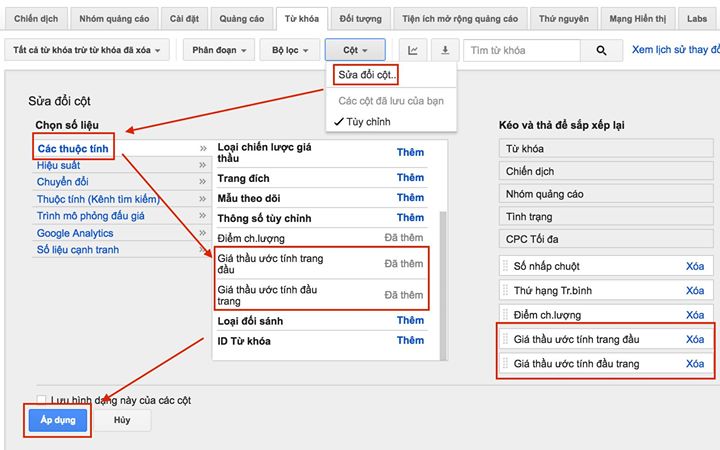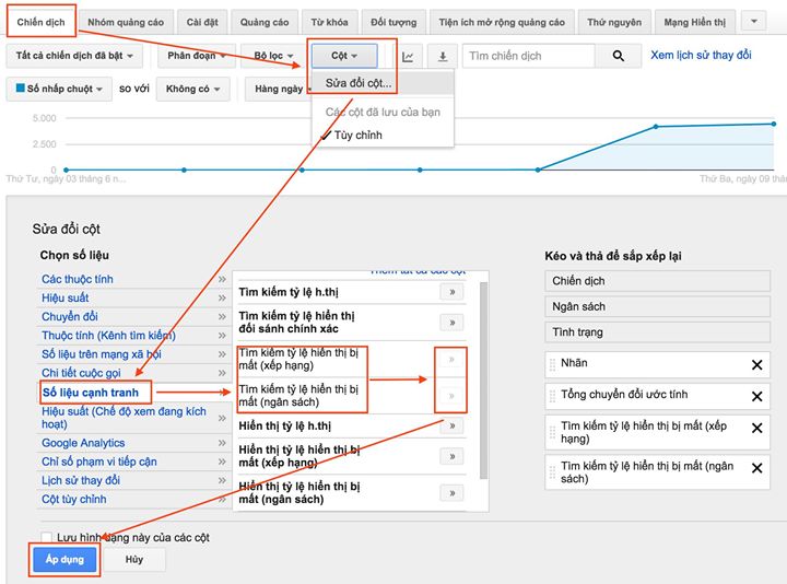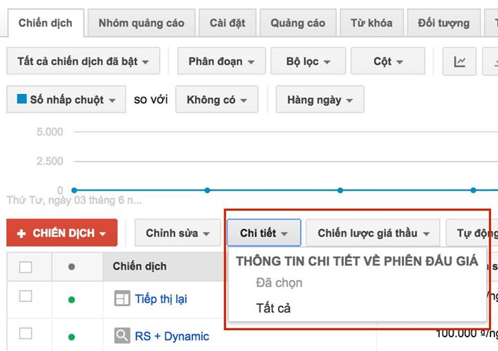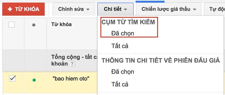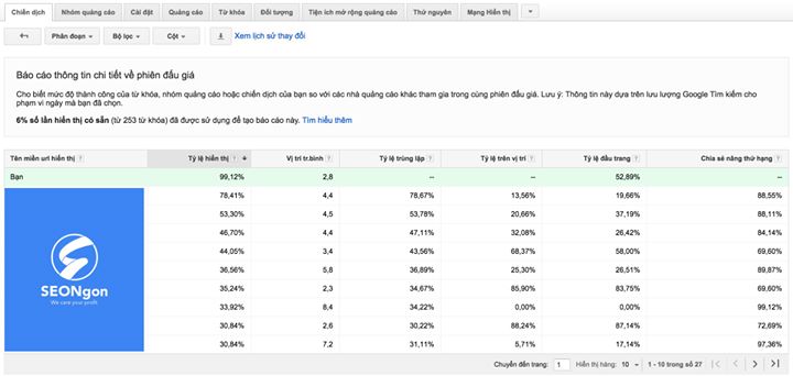 + Bạn có thể xem số liệu so sánh này ở cấp chiến dịch, nhóm quảng cáo, từ khoá. Có thể xem tất cả hoặc chọn từng chiến dịch, từng nhóm hoặc từ từ khoá cụ thể để xem