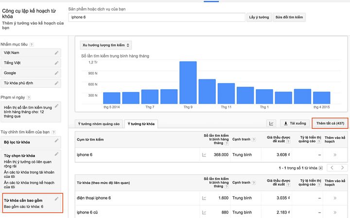 Tuy nhiên các từ khoá gợi ý có rất nhiều từ … chẳng liên quan. Vì vậy bạn phải thêm yêu cầu về “Từ khoá cần bao gồm”. Chú ý là từ khoá bao gồm mà dài quá thì Google không “sáng tạo” được. Thay vì mình yêu cầu Google thêm các từ “iphone 6” trong gợi ý thì mình chỉ bắt Google thêm số 6