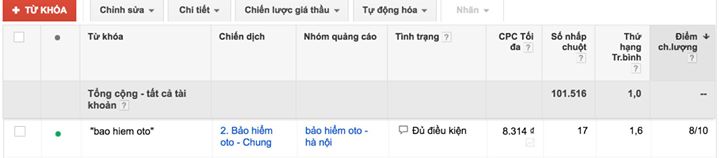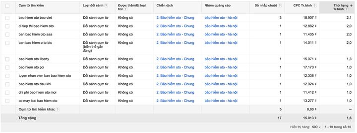 Trong ví dụ này, từ khoá “Bảo hiểm ô tô” có thứ hạng trung bình là 1,6.