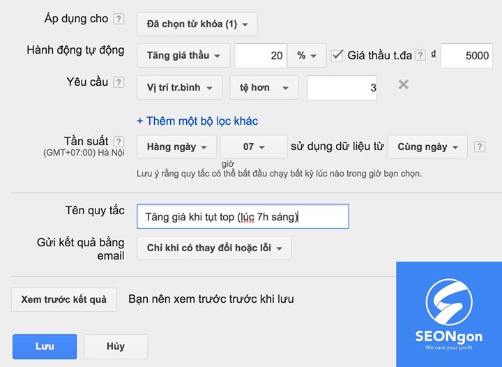Tiếp theo bạn chọn tăng Bid hay giảm Bid. Như trong hình dịch ra là: tăng giá thầu 20% (max 5.000đ) nếu vị trí từ khoá tệ hơn 3, quy tắc sẽ chạy vào lúc 7h sáng và lấy số liệu trong ngày.