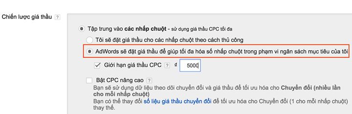 Lúc này Google sẽ tính toán và bid để bạn ở vị trí trung bình có nhiều click nhất (Tăng giá thì đắt, nhanh hết tiền; Giảm giá thì rẻ nhưng ít click). Nhớ đặt giới hạn giá thầu kẻo Google bid giá cao quá.
