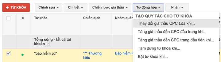 Bạn chọn từ khoá, các từ khoá, hoặc toàn bộ từ khoá muốn duy trì top, sau đó chọn Tự động hoá