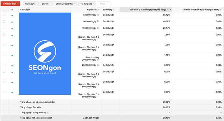 Cột số liệu đầu tiên (Tỉ lệ hiển thị) chính là % lượt hiển thị mà bạn đạt được. Bạn có thể lấy số liệu 2 cột mất hiển thị sẽ thấy cộng với tỉ lệ hiển thị này là được 100%.