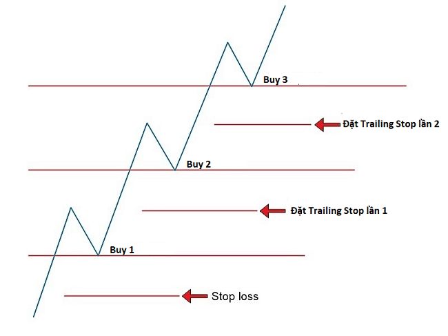 Ví dụ như hình minh họa ở trên, risk mỗi lệnh là 2% tương đương với 1 lot, đến lệnh thứ 3, chúng ta có tổng cộng 3 lot và Stop loss được dời lên tại điểm đặt Trailing Stop lần 2. Đến đây ta đã có lệnh đang mở 3 lot và không hề có rủi ro nếu chẳng may giá quay ngược đầu giảm xuống.
