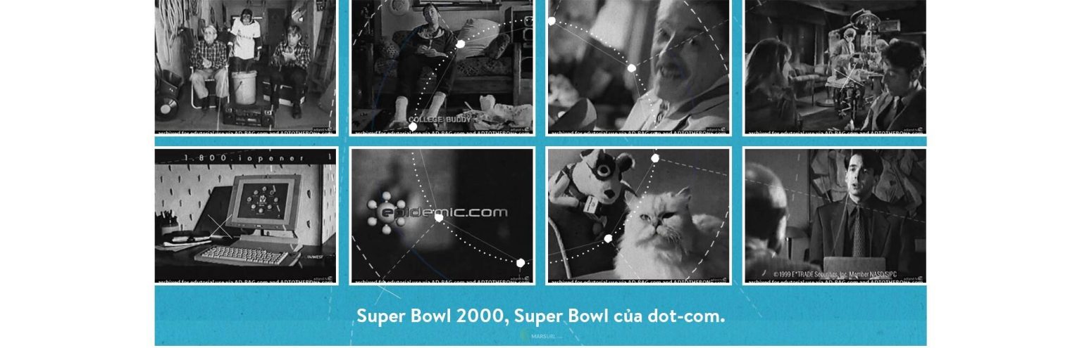 Năm 2000 sau đó cũng trở thành năm phình to nhất của bong bóng dot-com. Tại trận đấu bóng bầu dục Super Bowl XXXIV diễn ra ngày 30/1 năm đó, tổng cộng 22 suất chiếu được dành cho 19 công ty dot-com với giá trung bình 2,2 triệu USD/suất. Sự kiện văn hóa, thể thao lớn nhất của nước Mỹ sau này đi vào lịch sử với tên gọi “Dot-Com Super Bowl”.