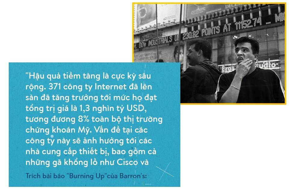 Trong khoảng thời gian này, số vốn đổ vào các hoạt động liên quan tới 2 lĩnh vực IT và Internet là 175 tỷ USD. Các startup Internet của năm 2000 chiếm đến gần một nửa, 84 tỷ USD, tăng gấp… 150 lần so với con số của năm 1994. Trong cơn sốt công nghệ, các ông lớn chuyên về hạ tầng và nền tảng như Microsoft, Oracle, Intel và Cisco đều chứng kiến trị giá của mình tăng chóng mặt. Tháng 12/1999, Microsoft đạt 619 tỷ USD. Năm 2000, Cisco, gã khổng lồ network, đạt 552 tỷ USD trị giá. Một nhà phân tích khẳng định “1000 tỷ USD là mục tiêu nằm trong tầm tay”.