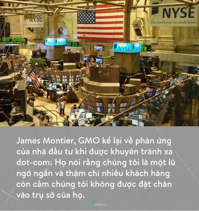 Tệ hại hơn, giữ cái đầu tỉnh táo trong thời đại điên cuồng sẽ buộc bạn phải trả giá đắt. Tính đến đầu năm 2000, Jean-Marie Eveillard mất tới 2/3 khối tài sản quản lý. Quỹ Tiger Funds của Julian Robertson từ chỗ gia tăng quy mô gấp 85 lần trong vòng 3 thập kỷ trước đó phải đóng cửa ngay trước khi bong bóng vỡ. Trong vòng vài năm cuối thập niên 1990, khối tài sản được quỹ GMO của huyền thoại Jeremy Grantham quản lý sụt giảm tới 45%. Điểm chung của các quỹ này: họ khuyến cáo nhà đầu tư tránh xa dot-com.