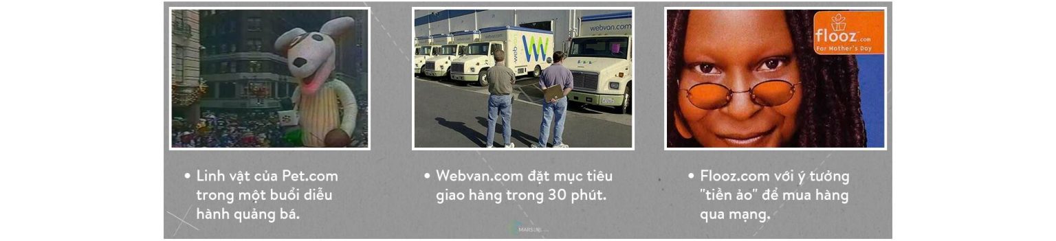 Các dot-com khác cũng theo đuổi chiến lược tương tự, nhưng… viển vông hơn. Ví dụ điển hình: Pets.com, một dot-com bán vật phẩm dành cho thú nuôi. Doanh thu của trang này trong năm đầu chỉ là 619.000 USD nhưng chi phí quảng cáo lên tới 11,8 triệu USD. Hàng hóa luôn được bán ra ở mức giá thấp hơn đáng kể so với giá nhập kho để hút càng nhiều thị phần càng tốt.