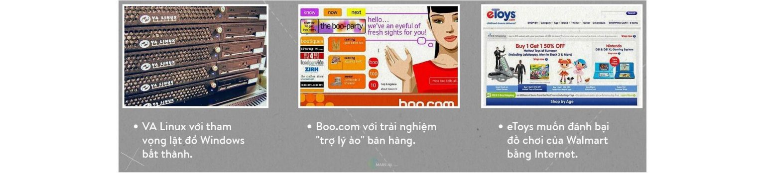 Hoặc Webvan.com (bán thực phẩm) vừa mới thành lập đã dành ra tới 1 tỷ USD để xây dựng hàng chục nhà kho trị giá 30 triệu USD cũng như một đoàn xe vận chuyển khổng lồ để giao hàng tới tay người mua trong vòng… 30 phút kể từ ngày nhận đơn. Mắc cùng một sai lầm tương tự là Kozmo.com với triết lý bán game, dvd, tạp chí… qua mạng.