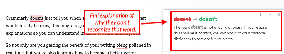 Grammarly không chỉ cho bạn biết khi có điều gì đó không ổn. Mặc dù điều đó hoàn toàn ổn, nhưng chương trình này tiến thêm một bước với các giải thích để bạn có thể hiểu để học hỏi và cải thiện.