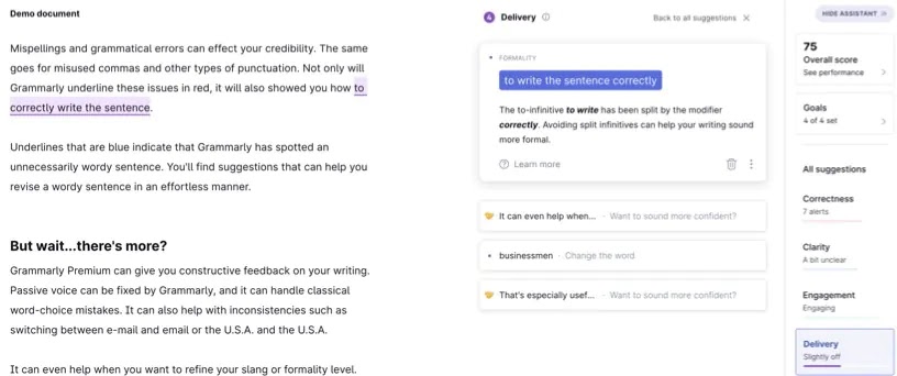 Grammarly chắc chắn là công cụ kiểm tra ngữ pháp trực tuyến tốt nhất hiện nay trên thị trường. Nó có thể phát hiện và đề xuất sửa chữa cho hầu hết các lỗi chính tả, dấu câu và ngữ pháp.