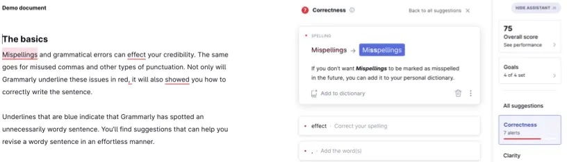Báo cáo lỗi chính tả và ngữ pháp là nghiêm trọng nhất. Grammarly gạch chân bất kỳ từ nào bị lạm dụng hoặc viết sai chính tả bằng màu đỏ. Nó cũng làm nổi bật các lỗi ngữ pháp và dấu câu. Bằng cách di chuột qua từ được gạch chân, người viết có thể thấy phần sửa lỗi được đề xuất và chọn chấp nhận hoặc bỏ qua nó như một phần của quá trình kiểm tra ngữ pháp toàn diện hơn