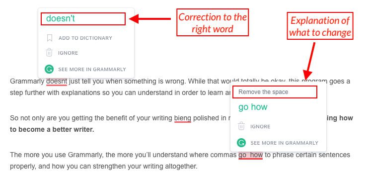Giống như tính năng kiểm tra chính tả của Microsoft Word và Google Doc, Grammarly sẽ gạch chân những từ hoặc ngữ pháp sai và cho bạn biết cần thay thế từ nào và tại sao nếu bạn chỉ cần di chuột qua từ đó.