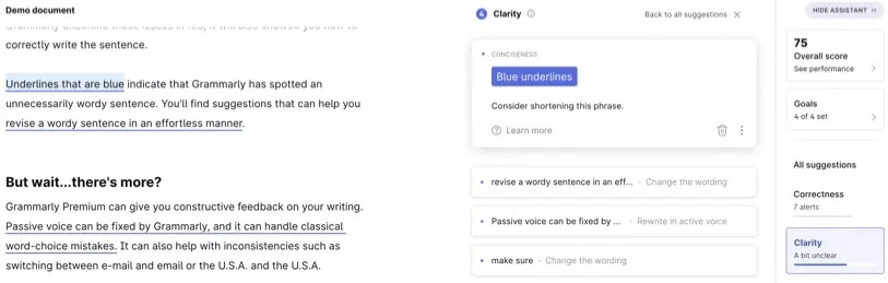 Grammarly gạch chân các cụm từ và câu khó đọc bằng màu xanh lam. Các đề xuất của nó liên quan đến cấu trúc câu, cách sử dụng từ và khả năng đọc tác phẩm của bạn. Người viết có thể chấp nhận hoặc bỏ qua các đề xuất. Grammarly Premium cũng sẽ đề xuất viết lại toàn bộ câu ở đây. Các đề xuất của Grammarly khác nhau dựa trên phong cách ưa thích và mục tiêu viết của bạn. Tôi sử dụng tính năng này hàng ngày để viết lại hoặc chỉnh sửa tác phẩm của các nhà văn tự do cho trang web của mình.