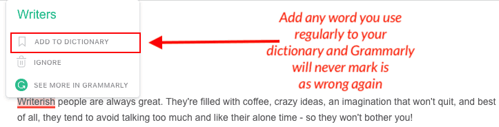 Điều này là hoàn hảo nếu bạn có bất kỳ từ nào bạn sử dụng thường xuyên mà không nhất thiết phải là từ “thực”, chẳng hạn như tên thương hiệu, tiếng lóng hoặc từ viết tắt. Không cần phải sửa từng lỗi này nếu bạn chỉ cần nhấp vào “thêm vào từ điển” khi Grammarly đánh dấu lỗi đó lần đầu tiên.