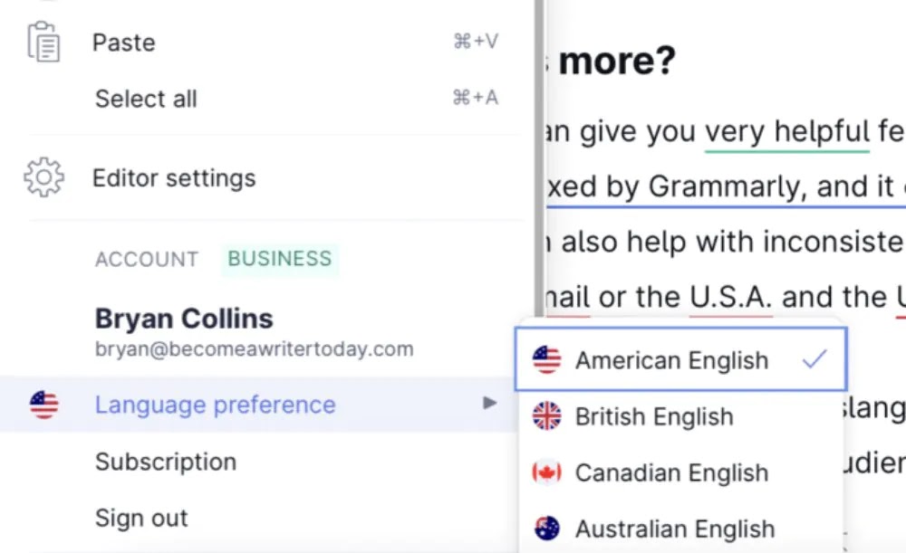 Sau khi cài đặt Grammarly, hãy đặt xem bạn đang viết tiếng Anh Mỹ, Anh, Canada hay Úc. Mở tài liệu Grammarly, nhấp vào menu hamburger và chọn tùy chọn ngôn ngữ có liên quan của bạn. Bạn có thể thay đổi giữa các biến thể tiếng Anh bất cứ lúc nào.