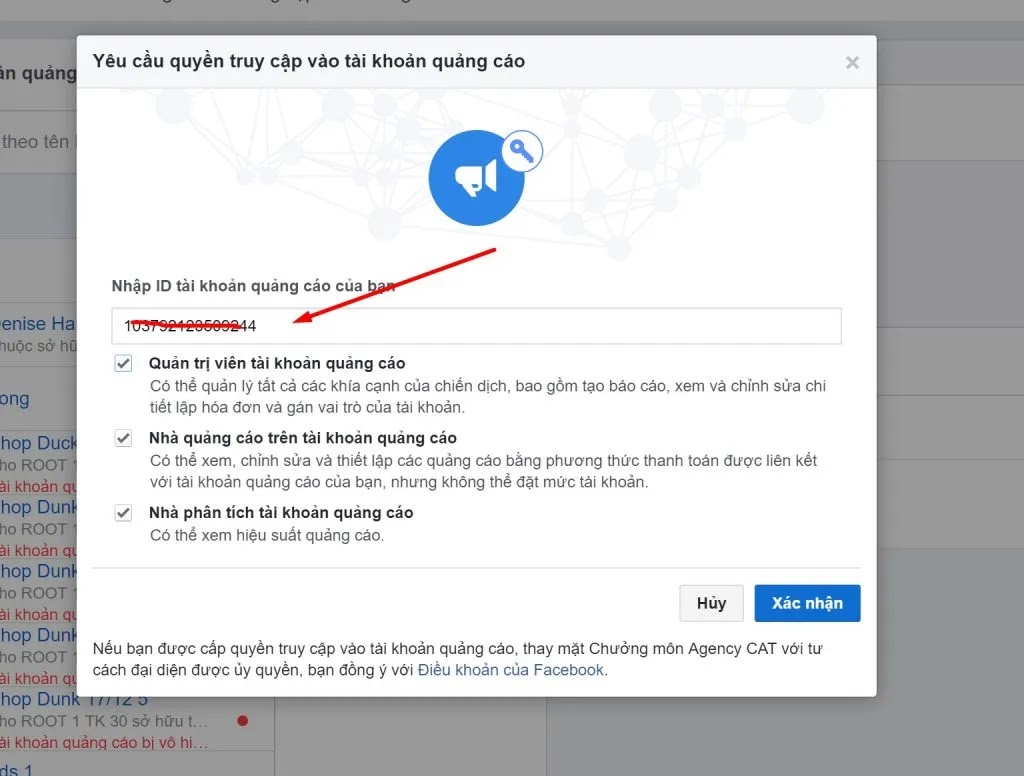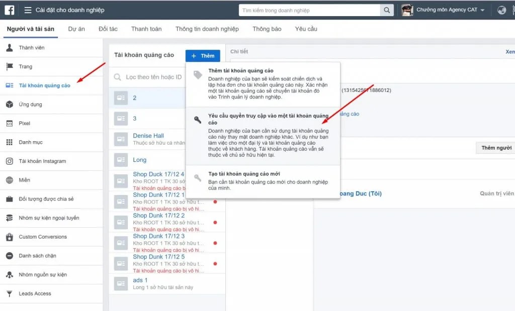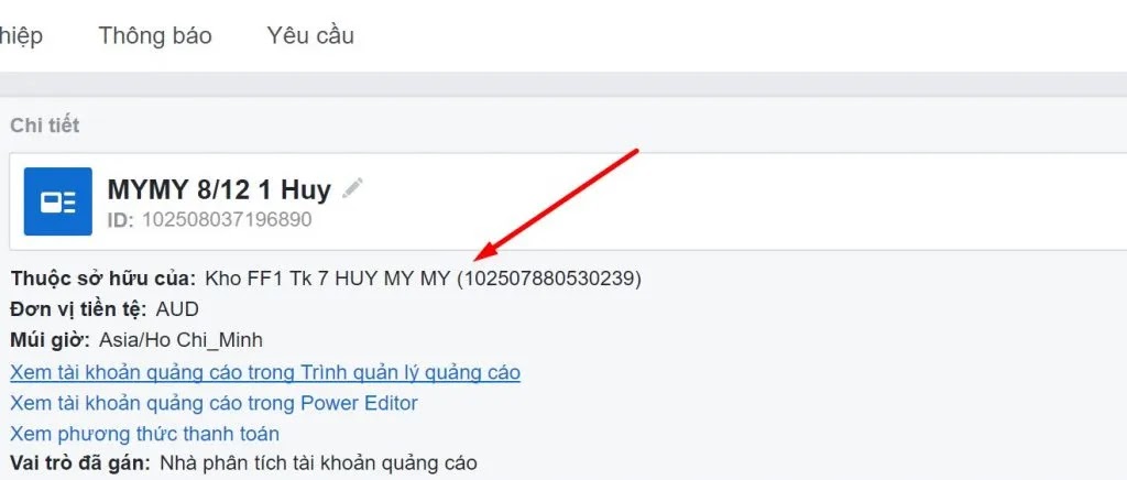 Bước 2. Đưa tài khoản cá nhân đã sống vào BM: Trong đường link quản lý tài khoản quảng cáo cá nhân, bạn copy ID của tài khoản quảng cáo facebook.com/ads/manager/accounts —> Vào BM chọn mục Tài Khoản Quảng Cáo —> Yêu cầu quyền truy cập …. —> làm theo hình bên dưới