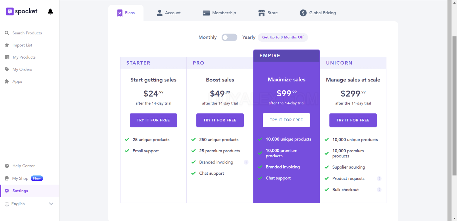 - Phí: Tùy vào nhu cầu kinh doanh mà bạn có thể chọn các gói khác nhau. Tất cả các gói đều có 14 ngày dùng thử miễn phí. Gói phổ biến nhất là $49.99/ 1 tháng, bạn sẽ có 250 sản phẩm phổ biến và 25 sản phẩm Premium. Sản phẩm Primium thường có tính cạnh tranh thấp, lợi nhuận cao và nhiều ưu đãi hơn.