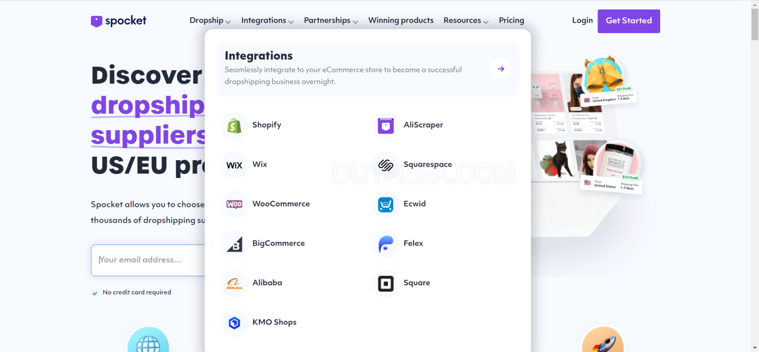Bạn nhấn vào đây để bắt đầu đăng ký một tài khoản Spocket. Với tài khoản này bạn có thể dùng để kinh doanh trên nhiều nền tảng như Shopify, Wix, Woocomerce…