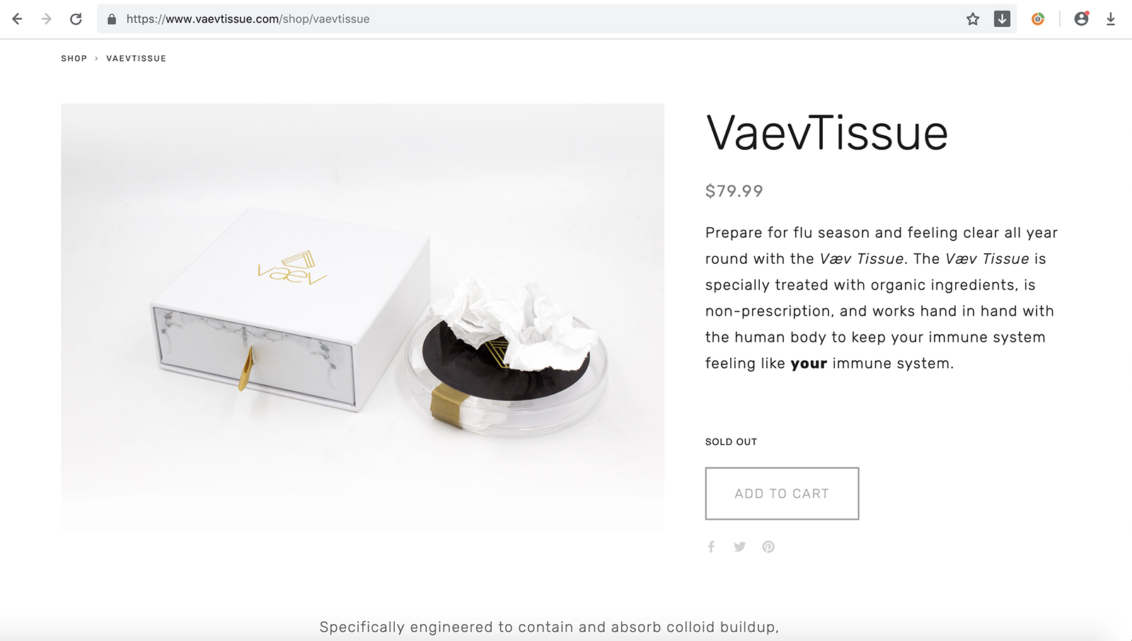 Mẩu khăn xì mũi chỉ được bán qua mạng với giá “cắt cổ” 79,99 USD, cam kết giúp người dùng “chuẩn bị sẵn sàng cho mùa cúm.”