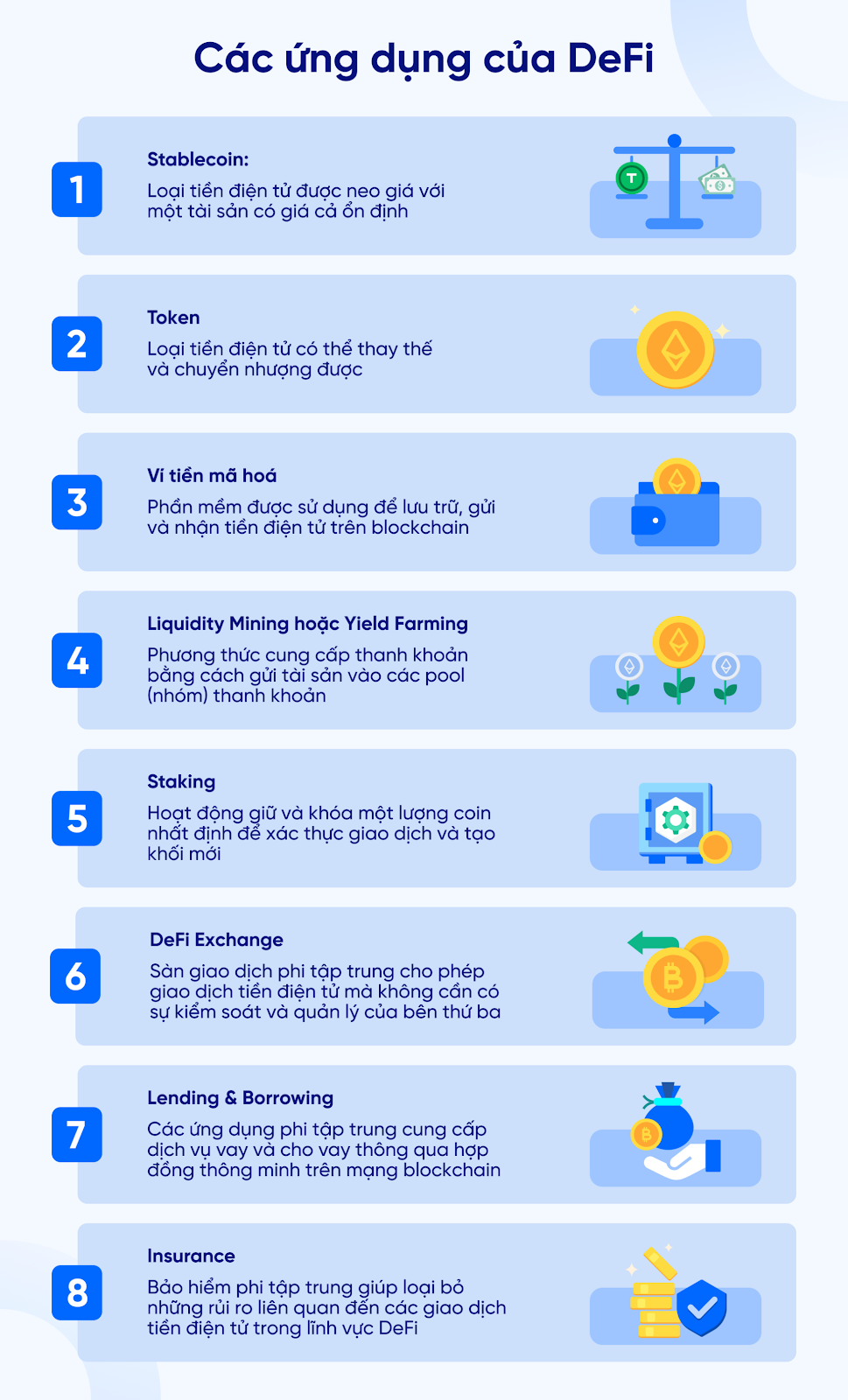 Cốt lõi của mô hình hoạt động của DeFi là các hợp đồng thông minh và blockchain Ethereum tạo điều kiện cho các giao dịch tài chính tự động, an toàn mà không cần sự giám sát tập trung. Hệ sinh thái này hỗ trợ nhiều ứng dụng khác nhau, chẳng hạn như sàn giao dịch phi tập trung (DEX), giao thức cho vay (Lending & Borrowing), giao thức phái sinh (Derivatives Protocols), stablecoin, Liquidity Mining, Yield Farming, Staking, bảo hiểm phi tập trung (insurance),…